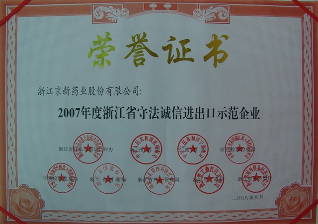 為樹立守法誠信進出口企業典型,推進進出口企業誠信體系建設,浙江省打私與海防口岸辦、杭州海關、寧波海關、浙江檢驗檢疫局、寧波檢驗檢疫局、省國稅局、省外匯管理局、省工商局、省外經貿廳聯合在全省范圍內開展了2007年度守法誠信進出口示范企業推薦活動。經各市打私辦與有關職能部門共同推薦,省級有關部門共同審核,公布了2007年度浙江省守法誠信進出口示范企業,我公司榜上有名。